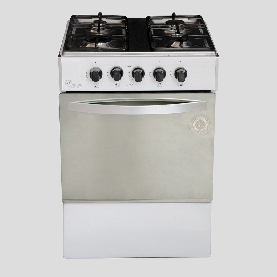 بوتاجاز المصانع من الستانلس ستيل المقاوم للصدأ بمقاس 55×55 سم. يتميز بشعلات فنشوري عالية الكفاءة وباب فرن من الزجاج الحراري الآمن